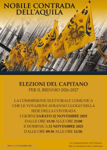 La Commissione Elettorale comunica che le votazioni avranno luogo nella sede della Contrada i giorni sabato 22 novembre 2025 dalle ore 15:30 alle ore 23:00 e domenica 23 novembre 2025 dalle ore 09:30 alle ore 12:30.